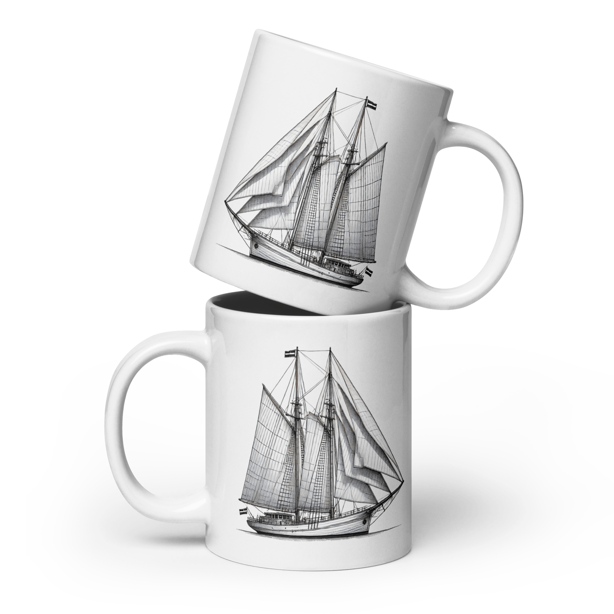 'Gaff Rig Ketch' Sailboat Line Drawing - White Glossy Ceramic Mug